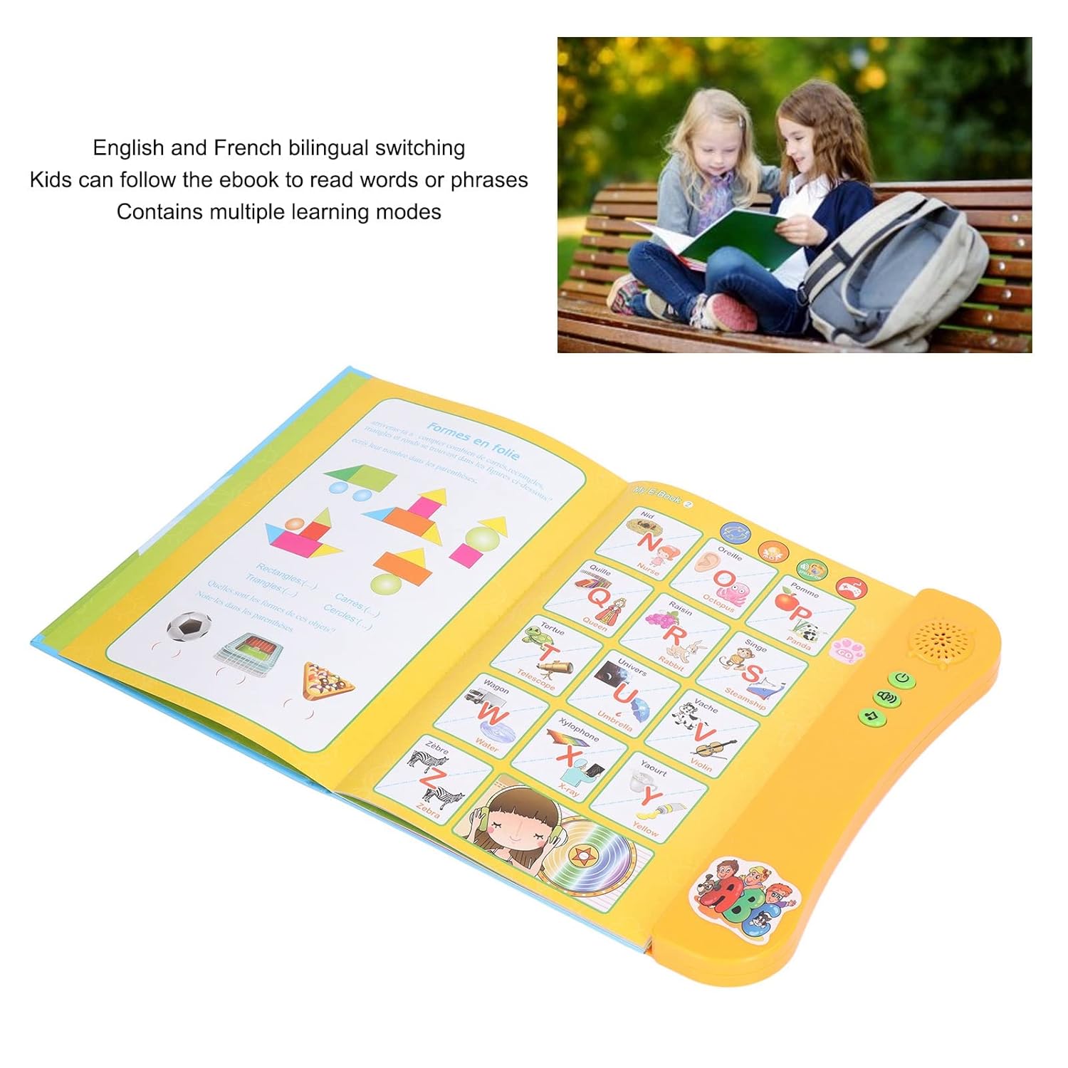Lecture et apprentissage : Grâce à la fonction bilingue anglais-français, les enfants peuvent suivre le livre d’apprentissage pour lire des mots ou des phrases. Plusieurs modes d’apprentissage sont disponibles pour répondre à tous les besoins.
